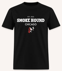 This trendy black t-shirt celebrates the establishment of Smoke Hound in 2022. The design features bold lettering that reads “SMOKE HOUND CHICAGO” paired with a quirky illustration of a dog puffing out smoke. The dog, drawn in red tones, adds a playful and distinctive touch to the shirt. A great choice for those who want to showcase a unique, fun design that combines urban style and a hint of humor.