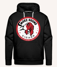 Stay cozy and stylish with this exclusive "Smoke Hound" Cigar Club Hoodie. The front of this black hoodie features the brand's distinguished circular logo, highlighting a cool Basset Hound enjoying a cigar. The design is framed with red and white accents, and includes the motto, "Savor the experience, smoke a cigar." Made from a soft, warm, and comfortable material, this hoodie is a must-have for any cigar enthusiast who wants to show their love for the brand.