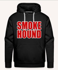 Stay warm and stylish with the official "Smoke Hound" hoodie. This cozy black hoodie features the brand's name in large, bold red lettering with a crisp white outline on the front. It's a simple, classic design that stands out and is perfect for making a statement. Made from a comfortable and durable fabric blend, this hoodie is ideal for everyday wear, whether you're relaxing at home or heading out on a cool evening.