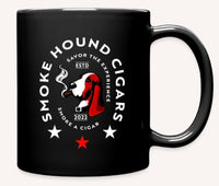 Enjoy your favorite beverage in style with the "Smoke Hound Cigars" Heritage Logo Mug. This sleek black mug features the brand's distinguished logo, showcasing a classy Basset Hound smoking a cigar. The design is circled by the brand name, with the motto, "Savor the experience, smoke a cigar," and the founding year, "ESTD 2022," adding a touch of vintage charm. Made from durable ceramic, this mug is perfect for coffee, tea, or any drink, and is a great way to show off your love for cigars and unique brands.